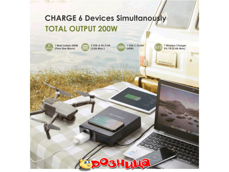 AllPowers S200 200W/154Wh 41600mAh; Характеристики портативных зарядных станций: 200Вт 154Вт/час; Характеристика аккумуляторной батареи: литий-ионный; Цвет: Чёрный; Габариты (ШхВхГ и вес): 206мм 110мм 165мм 1.4кг