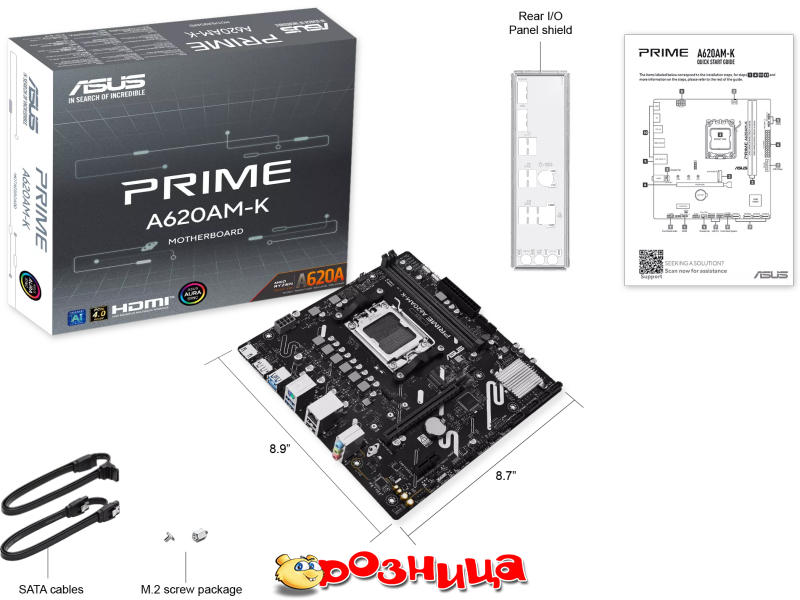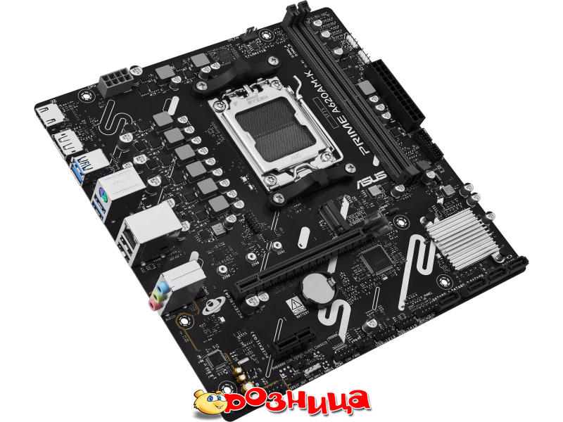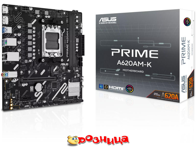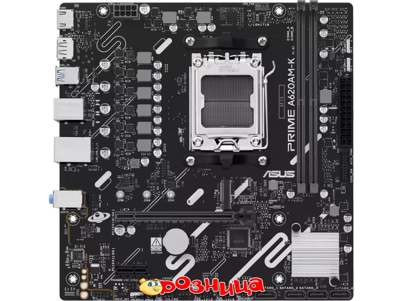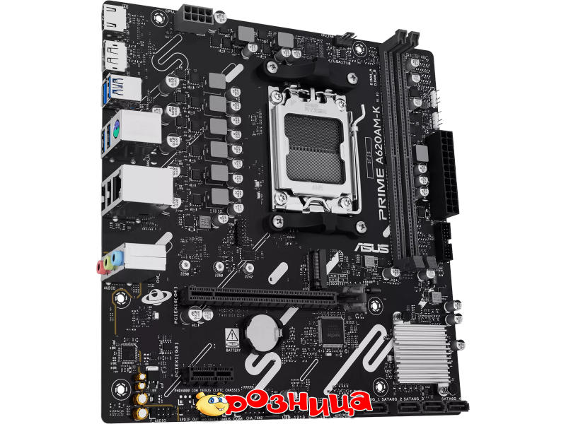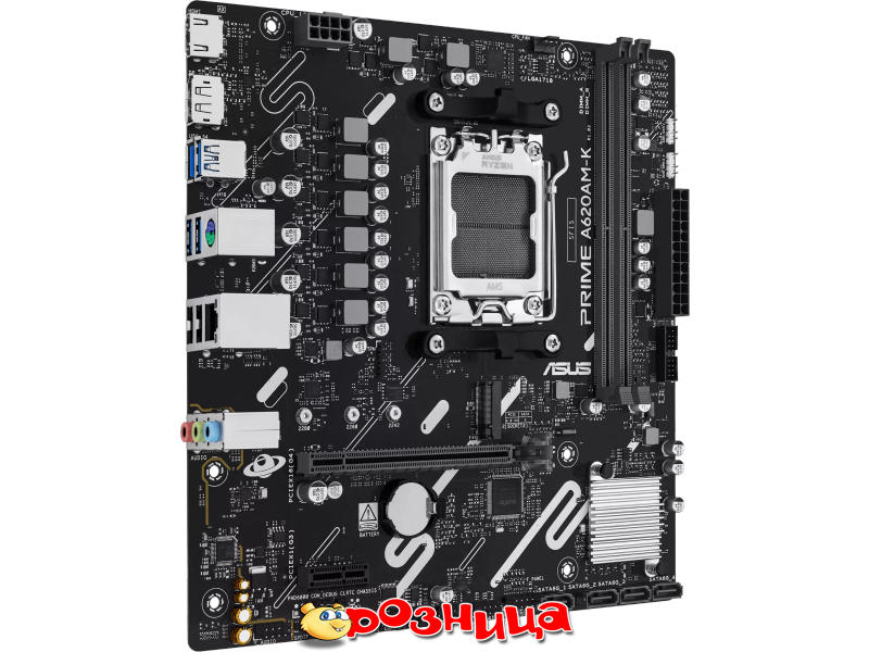 ASUS PRIME A620AM-K; Характеристика материнской платы: AM5 AMD A620A DDR5 SDRAM 2шт 10/100/1000Мбит Micro-ATX