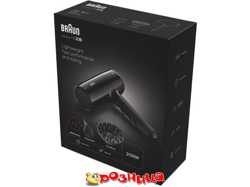 Braun BRHD215E; Характеристика фена/характеристика выпрямителя для волос: обычный фен 2100Вт; Цвет: Чёрный