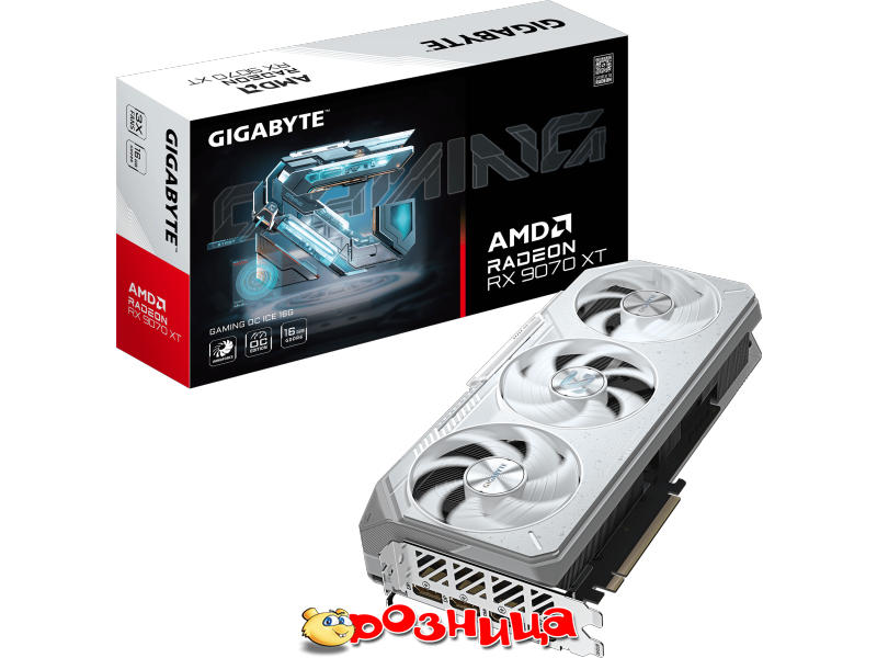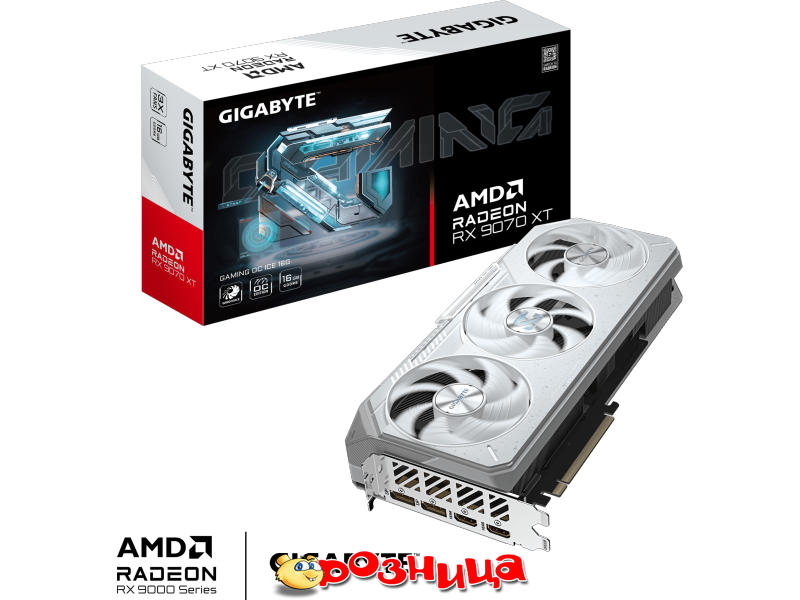 Gigabyte Radeon RX 9070 XT GAMING OC ICE 16GB GV-R907XGAMINGOCICE-16GD; Video: AMD Radeon RX 9070 XT 16ГБ GDDR6 3060МГц 20000МГц 256бит PCI Express 5.0 DirectX 12; Cooler: Активная; Разъёмы: DisplayPort, HDMI