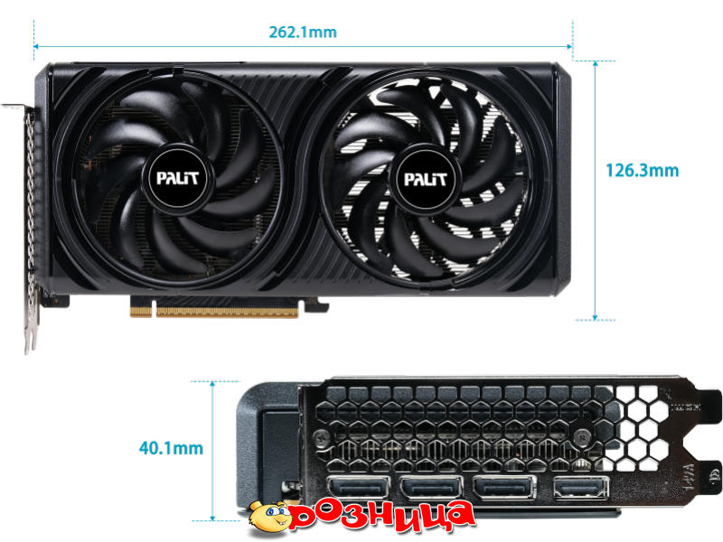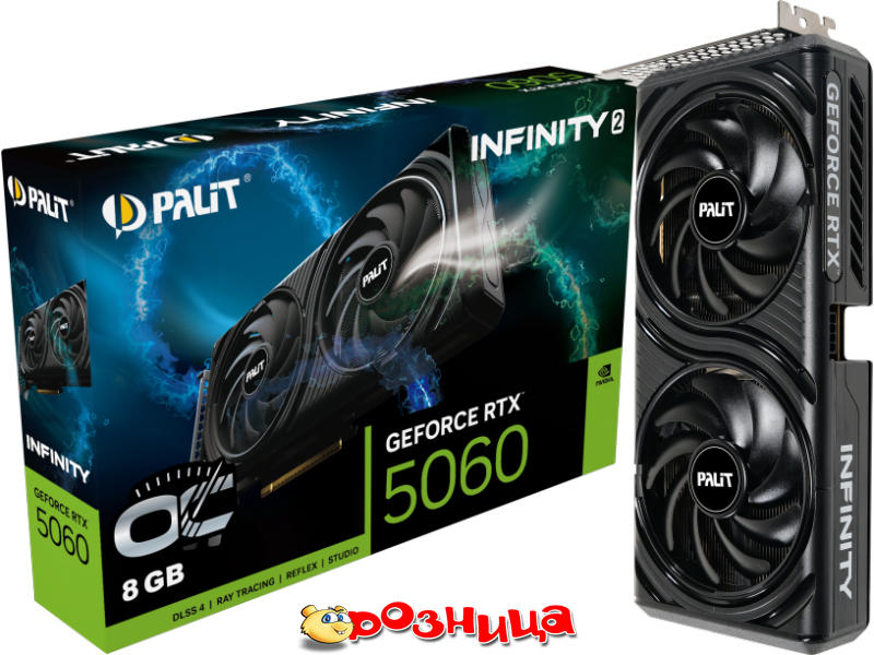 Palit GeForce RTX 5060 Infinity 2 OC 8GB NE75060V19P1-GB2063L; Video: NVIDIA GeForce RTX 5060 8ГБ GDDR7 2512МГц 28000МГц 128бит PCI Express 5.0 DirectX 12; Cooler: Активная; Разъёмы: DisplayPort, HDMI