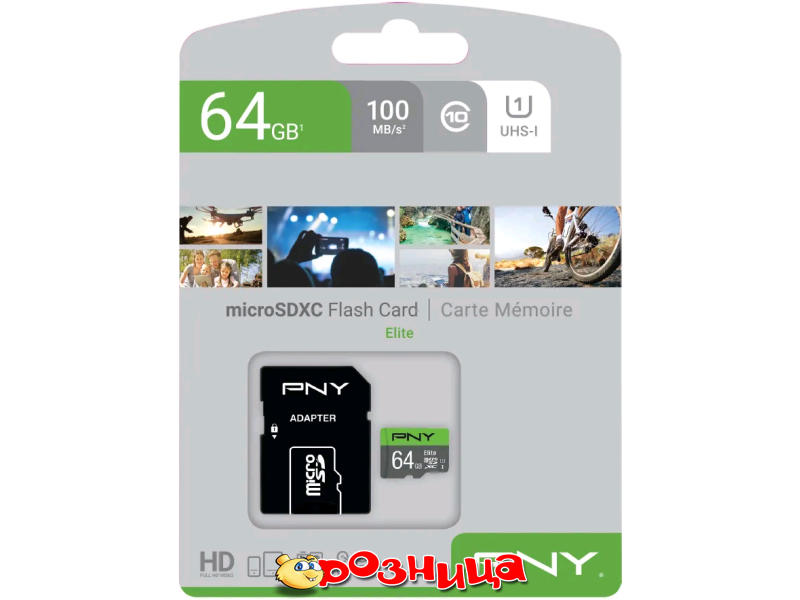 | Описание | MicroSDXC card 64G C10 UHS-I PNY Elite 100MB/s + adapter, PNY, P-SDUX64U185GW-GE, 60 |