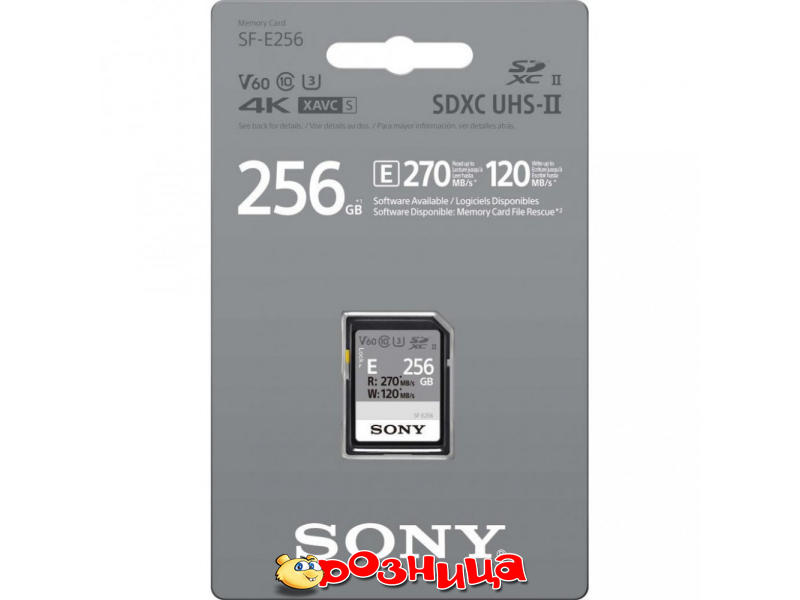 | Описание | SONY Flash | Накопичувачі та Flash память | Карти пам`яті Flash | SFE256.AE | Картка памяти Sony 256GB SDXC C10 UHS-II U3 V60 R270/W120MB/s Entry | warranty 12 |