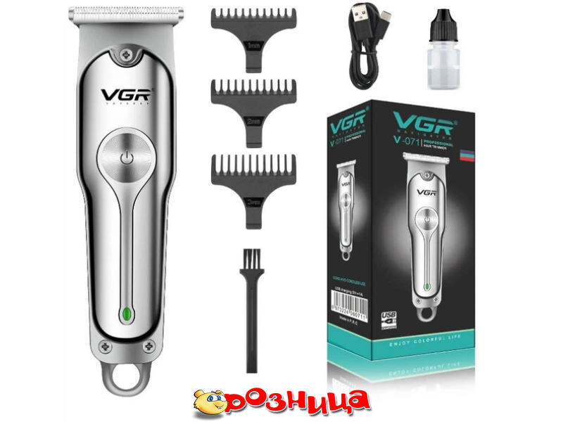 VGR V-071 40040; Характеристика машинки для стрижки волос: набор для стрижки 3 0.5мм 3мм 2ч 120мин аккумулятор, сеть; Цвет: Серебристый